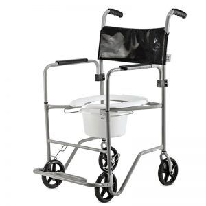 " Construída em aço carbono " Pintura eletrostática epóxi " Apoio de pés retrátil " Apoios de braços removíveis " Recipiente coletor " Freios bilaterais " Largura 44cm " Capacidade para 90 Kg